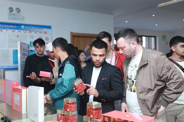 4 月 13 日,宁夏银川,2025“未来之桥”中国-中亚青年领导人研修交流营期间,中亚青年代表在闽宁新貌展示中心了解闽宁镇的枸杞,深入感受从“干沙滩”到“金沙滩”的发展奇迹,见证中国乡村振兴的生动实践。共青团宁夏回族自治区委供图