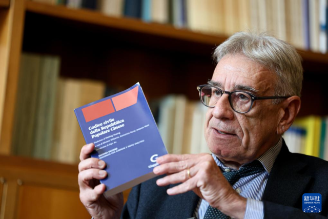 4月23日,在意大利罗马,奥利维耶罗·迪利贝托教授在办公室展示中国民法典意大利文版。新华社记者 李京 摄