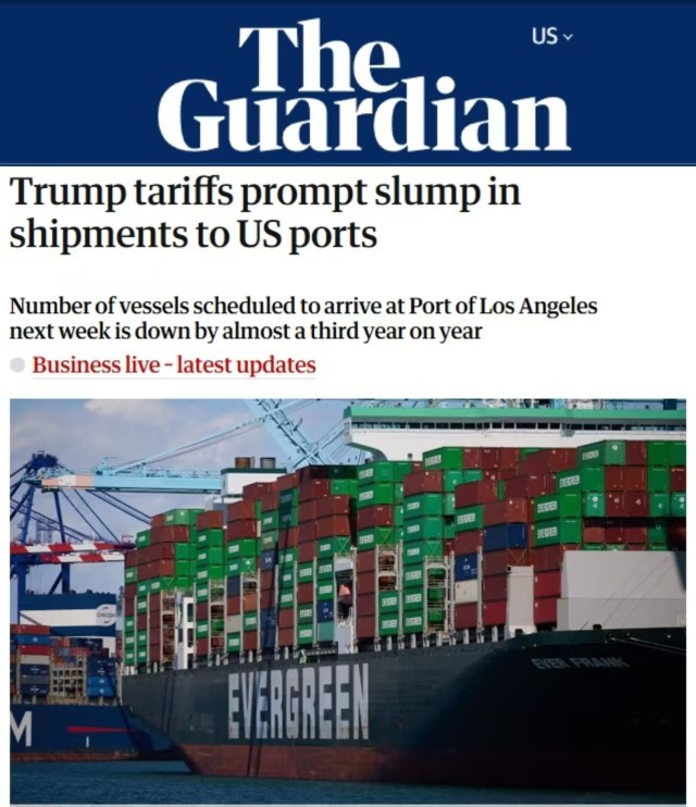 文章称,美国政府反复无常的贸易政策已导致美国最重要港口的货运量急剧下滑。数据显示,作为西半球最繁忙的港口,洛杉矶港下周计划到港船舶数量较去年同期骤减近三分之一,这也再次印证了美国关税政策正在冲击美国经济。经济学家警告称,美国政府挑起的贸易战将导致全球贸易显著放缓,并可能推高物价,增加美国经济衰退的风险,这一切最终还是由美国消费者买单。