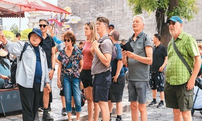 近日,外国游客在陕西省西安市莲湖区回民街美食文化街区游玩。