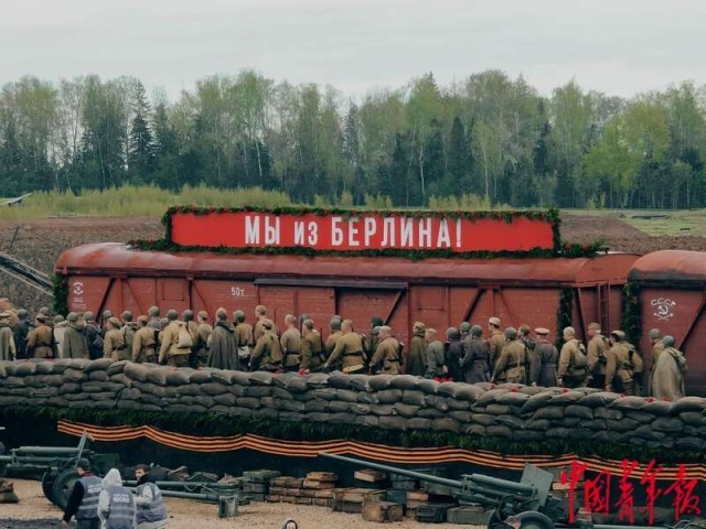 5月4日,俄罗斯莫斯科,沉浸式“历史重塑”话剧《胜利!国会大厦上的旗帜》在莫斯科电影公园上演。图片展示的是胜利后的苏军士兵搭乘火车“返回”苏联的场景,火车上的标语为“我们从柏林归来”。中青报·中青网驻俄罗斯记者 赵祺/摄