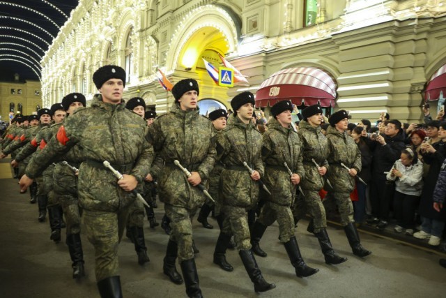 5月3日晚,受阅方队在俄罗斯首都莫斯科前往红场参加彩排。当日,俄罗斯纪念苏联伟大卫国战争胜利80周年阅兵式彩排在莫斯科举行。新华社记者 姚大伟 摄