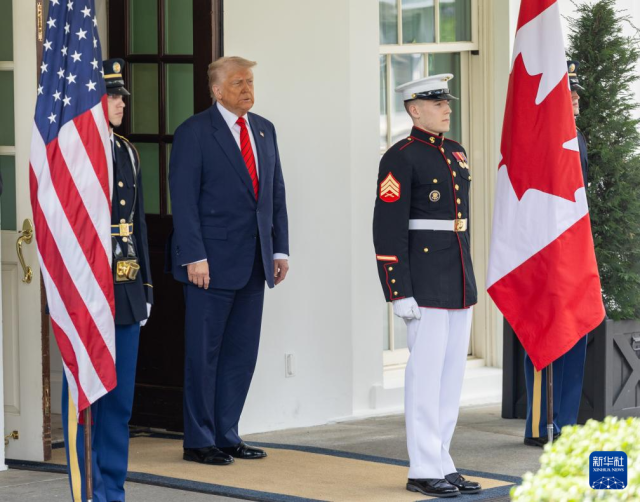 5月6日,美国总统特朗普(左二)在华盛顿白宫迎接到访的加拿大总理卡尼。新华社记者 胡友松 摄