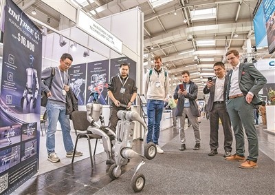 4月1日,在德国汉诺威工业博览会上,人们在宇树科技展区观看机器狗演示。
