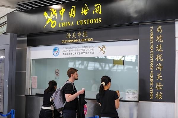 5月1日,上海浦东国际机场,“即买即退”离境退税海关验核点前,办理退税手续的外国旅客。视觉中国供图