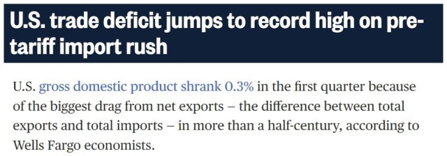 3月贸易逆差爆表,是因为美国企业在美政府全面征收“对等关税”之前抓紧增加了商品进口。