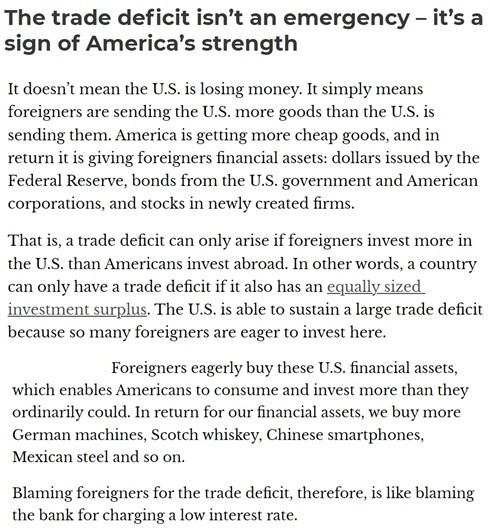 文章批评美国政府的关税政策不讲道理:“美国用美元和金融资产换来了德国的机械、英国的威士忌、墨西哥的钢材……现在却将贸易逆差归咎于贸易伙伴,这就好比责怪银行为我们提供低息贷款。”