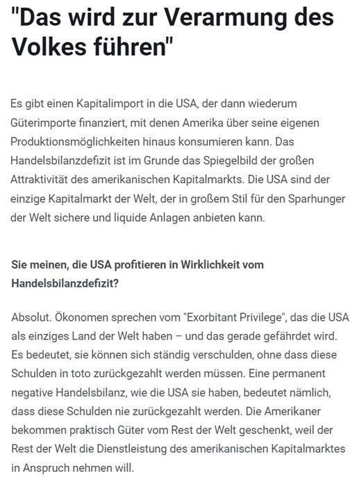 德国经济学家吕迪格·巴赫曼近日接受德媒专访时说得更直接:贸易逆差对于很多国家来说可能是经济出现麻烦的征兆,但对美国而言恰恰相反。