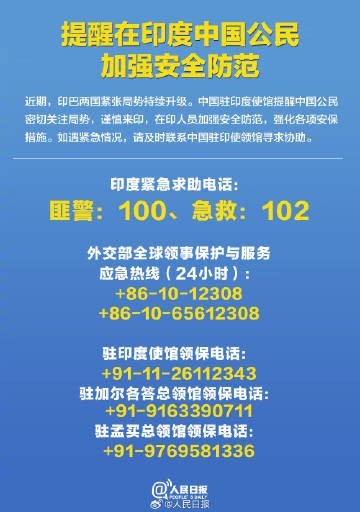 中国驻印度使馆提醒中国公民密切关注局势,谨慎来印,在印人员加强安全防范,强化各项安保措施。如遇紧急情况,请及时联系中国驻印使领馆寻求协助。