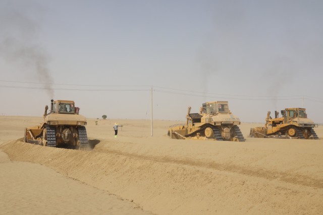 防沙治沙项目现场,大型机械正在平整沙漠 (日孜完古丽·买吐地 摄)