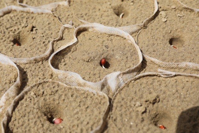 播种前,土地经过改良,混合化肥与羊粪的有机肥料被均匀撒入沙土,再装入育苗袋。在育苗袋里播种后,工作人员浇水、埋土、覆膜、搭建拱棚,确保幼苗在防风保温的环境中茁壮成长。