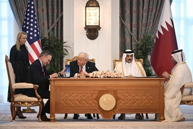 【环球时报驻埃及特派记者 黄培昭 薛丹 环球时报驻美国特约记者 李致 环球时报特约记者 林晓彤】当地时间15日,美国总统特朗普在访问卡塔尔后,飞往阿布扎比开启海湾之行第三站。综合法新社、路透社等媒体14日报道称,特朗普14日抵达多哈,卡塔尔埃米尔(国家元首)塔米姆在红地毯上迎接他的到来。早些时候,特朗普还在沙特首都利雅得会见了叙利亚政权领导人艾哈迈德·沙拉,而这是他在宣布美国将解除对叙利亚的制裁后的第二天。此外,沙特还承诺向美国投资6000亿美元,美沙13日签署了价值近1420亿美元的军售协议。