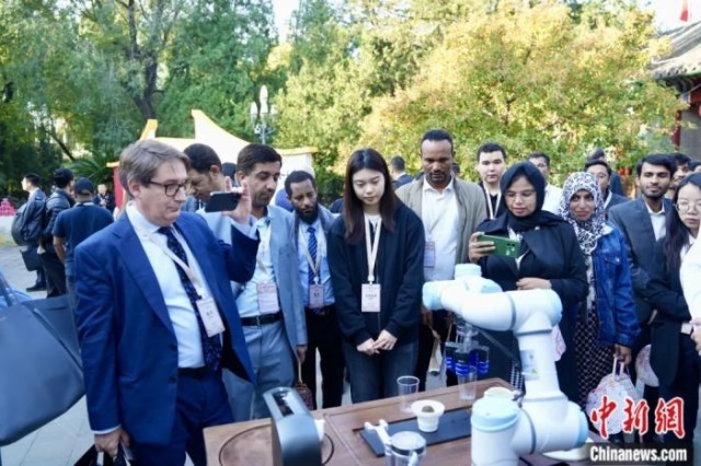 2024年10月15日,2024中欧人才论坛在北京举办。图为机器人茶艺展示平台吸引外国嘉宾。中新社记者 陈芳婷 摄