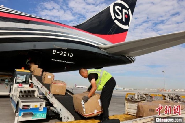 2024年8月15日,新疆乌鲁木齐地窝堡国际机场,顺丰航空一架全货机正在装运货物,准备飞往匈牙利首都布达佩斯。中新社记者 张宇 摄