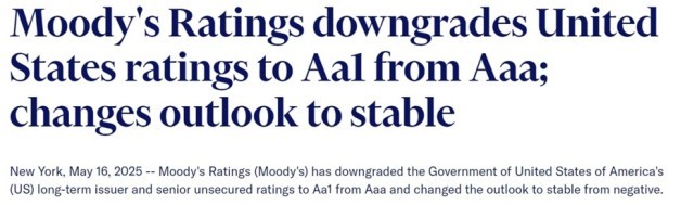国际信用评级机构穆迪公司16日宣布,由于美国政府债务及利息支出增加,该机构决定将美国主权信用评级从Aaa下调至Aa1,同时将美国主权信用评级展望从“负面”调整为“稳定”。