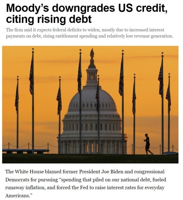 据美国《政治报》报道,穆迪宣布降级决定后,白宫立即将矛头指向上届民主党政府,指责前总统拜登和国会民主党人“堆积如山的国债支出助长了失控的通货膨胀”,称“特朗普政府和共和党人正致力于解决拜登留下的烂摊子”。