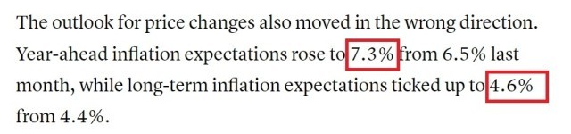 其中,一年期通胀预期从上个月的6.5%进一步飙升至7.3%,为1981年以来的最高水平;长期通胀预期也从上个月的4.4%升至4.6%,创下1991年以来新高。