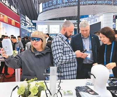 五月十八日,第三十四届哈尔滨国际经济贸易洽谈会开启公众开放日。洽谈会吸引了三十八个国家和地区经贸代表团、国内一千五百余家企业参展。图为外籍参观者在展区内选购商品。