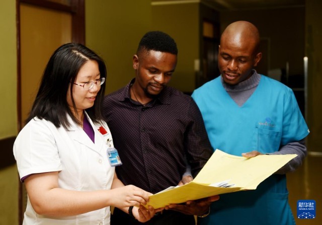 资料图:5月6日,在博茨瓦纳首都哈博罗内的玛丽娜公主医院,第17批援博医疗队哈博罗内分队队员、放射科医生蔡文超(左)与当地同事交流工作。 新华社发(策基索·特巴洛 摄)