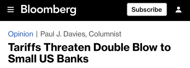 彭博社网站近日的一篇文章分析指出,关税威胁对美国小型银行造成双重打击。