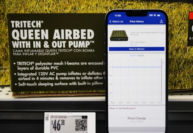价格跟踪软件上商品价格的涨幅有时赶不上实体店价格的实际变动。软件显示,一款中国产充气床垫价格从39.97美元涨至44.94美元,但货架上同款商品价签上显示的价格更高,达46.38美元。