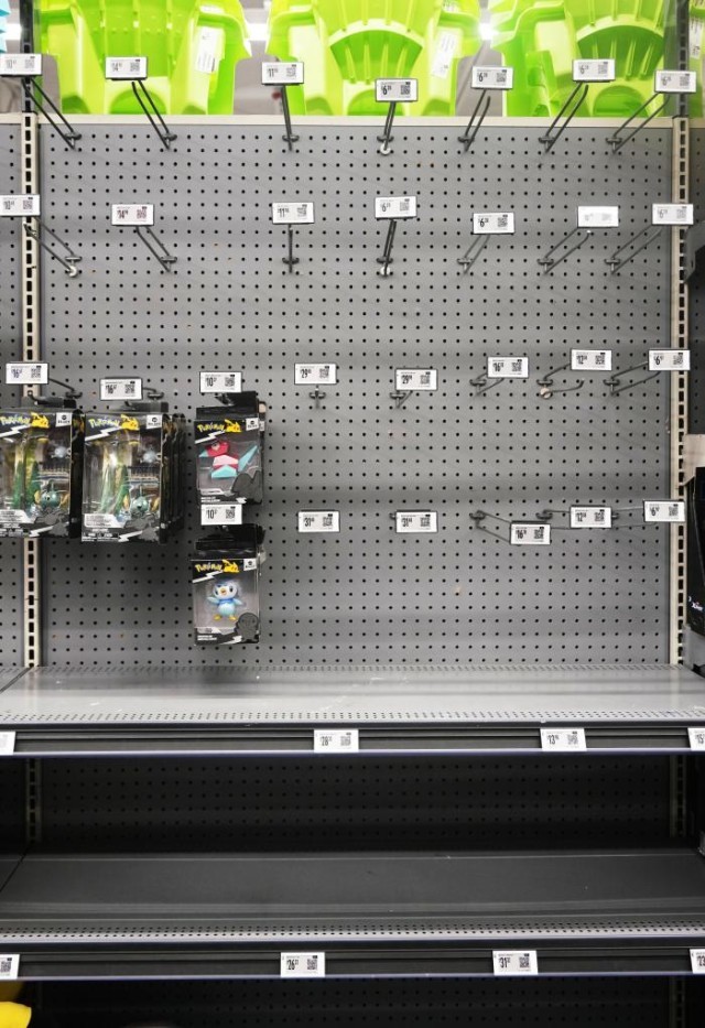 这是5月21日在美国加利福尼亚州旧金山湾区圣莱安德罗的一家沃尔玛超市拍摄的空荡的玩具货架。新华社记者 吴晓凌 摄