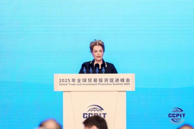 5月22日,由中国贸促会主办的2025年全球贸易投资促进峰会在北京举行。新开发银行行长、巴西前总统迪尔玛·罗塞芙在开幕式致辞。中国贸促会供图