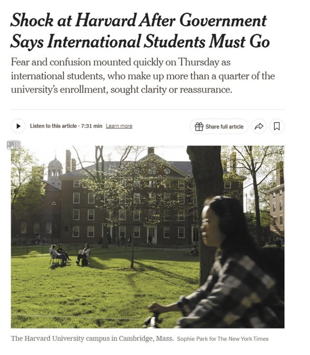 美国《纽约时报》22日题为“(美国)政府要求哈佛大学国际学生离开在该校引发震惊”的报道截图。