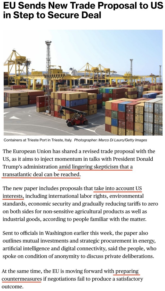 但目前外界对能否达成跨大西洋协议仍持怀疑态度。为此,欧盟同时也在推进反制措施的准备工作,以防谈判未能取得令人满意的结果。
