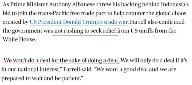 澳大利亚贸易部长法瑞尔近期也公开表示,澳大利亚政府不急于向美国方面寻求关税减免。