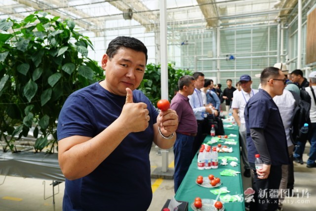 5月24日,在新疆农业博览园,嘉宾品尝西红柿后点赞。杨健摄