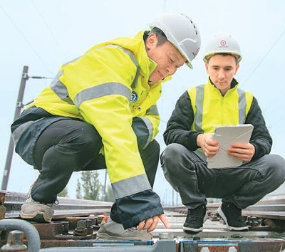 在塞尔维亚诺维萨德的匈塞铁路塞尔维亚段项目部营地,中国员工段伟(左)与外籍员工一起检查轨道施工情况。 王 韡摄(新华社发)