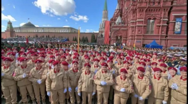 5月9日,阅兵入场准备时俄罗斯少年军方队特意同中国人民解放军仪仗司礼大队合影。网络视频截图