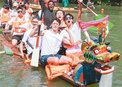 去年,我参加了由杭州余杭区五常街道组织的龙舟体验营,亲身感受竞渡带来的“速度与激情”。我和同校好友组成队伍,伴着耳边观众的热情欢呼挥桨出发,溅起的水花在河道绽放。握桨、入水、拉水、出水、回桨……随着龙舟划至终点,我们挥舞校旗、举桨欢呼。在龙舟运动中,我感受到了奋斗和团结的力量——不同肤色的人们在同一条水道上并肩奋进,这不正是“同舟共济”的东方智慧吗!