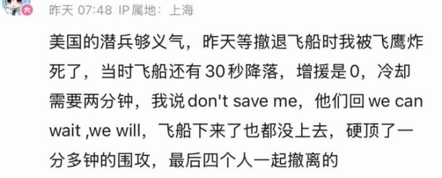 有中国玩家讲述了自己在游戏中和美国伙伴一起战斗的经历:我说don’t save me(不用救我了),他们回we can wait,we will(我们能等你,我们也会救你)。