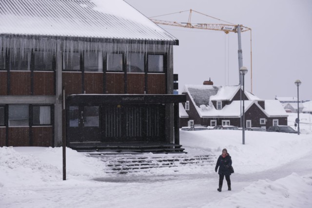 2025年3月24日,在丹麦自治领地格陵兰岛首府努克,一名行人经过格陵兰岛自治议会。新华社记者张玉亮摄