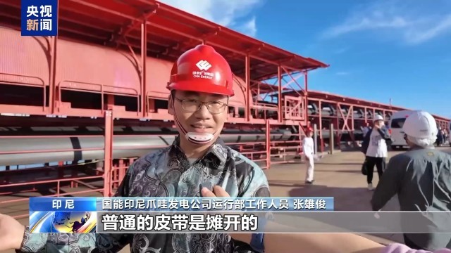 国能印尼爪哇发电公司运行部工作人员 张雄俊:普通的皮带是摊开的,但你看,我们这有3.6公里长的(管状)皮带,我们是管带机,那就是为了环保。
