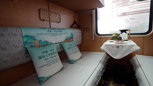 专列车身采用“丝路金桥”主题涂装,车内装饰融入大雁塔、古城墙、钟楼等西安地标以及哈萨克斯坦地标性建筑等元素。此外,专列上的文化活动也格外丰富。车厢内每日安排中医养生、手工制作、书画创作等文化交流活动,沿途还开展了合唱、民乐演奏等文化展演,让列车成为“流动的文化交流长廊”。