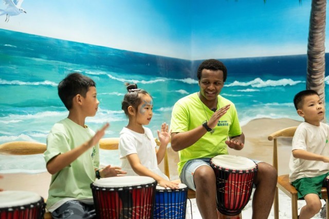 2024年8月30日,在位于湖南高桥大市场的中非经贸博览会常设展馆安哥拉馆,志愿者(右二)带领学生学习非洲鼓。新华社记者 陈思汗 摄
