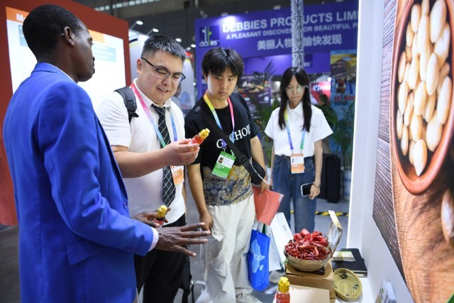 6月12日,在长沙国际会展中心,参展商推介卢旺达辣椒产品。当日,第四届中国-非洲经贸博览会在长沙举行。(图片来源:新华社)