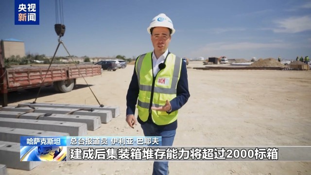 总台报道员 伊利亚·巴耶夫:该项目建设工程占地面积达19公顷,施工采用全天候作业模式,建成后集装箱堆存能力将超过2000标箱,为保障物流效率,配套新建了11条铁路专用线,目前首批轨道铺设工程已正式启动。