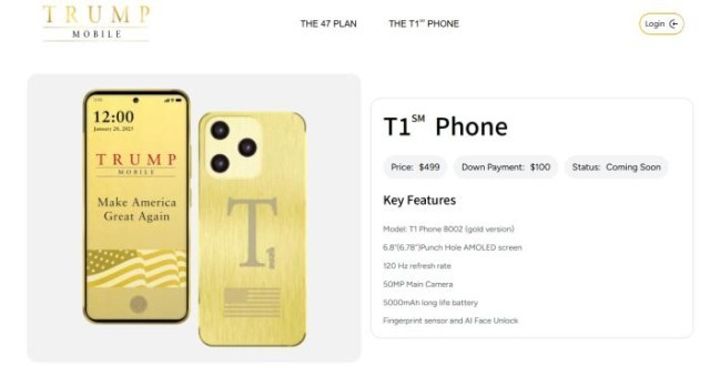 T1手机外壳为金色金属材质,并镌刻美国国旗图案。根据Trump Mobile网站发布的宣传图,这款手机屏幕显示出特朗普的知名竞选口号“让美国再次伟大”(Make America Great Again, MAGA)。目前这款手机的预售价格为499美元。