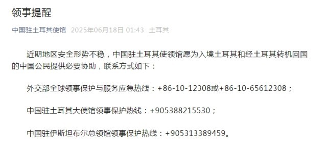 中新网6月18日电 中国驻土耳其使馆6月18日发布领事提醒:近期地区安全形势不稳,中国驻土耳其使领馆愿为入境土耳其和经土耳其转机回国的中国公民提供必要协助,联系方式如下: