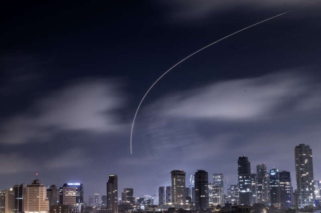 当地时间2025年6月17日,以色列特拉维夫,伊朗向以色列发射的弹道导弹划过天际。视觉中国供图