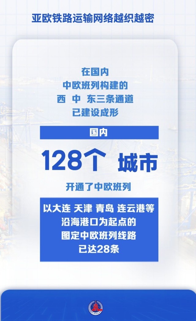 在国内,中欧班列构建的西、中、东三条通道已建设成形,国内128个城市开通了中欧班列,以大连、天津、青岛、连云港等沿海港口为起点的图定中欧班列线路已达28条。