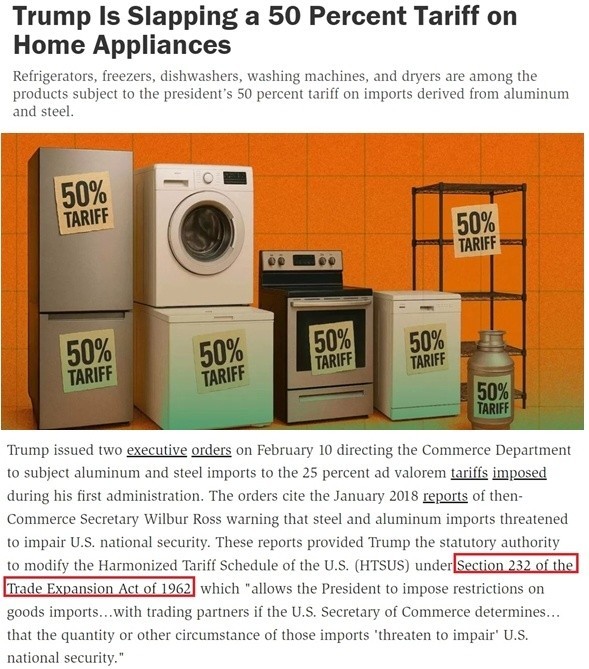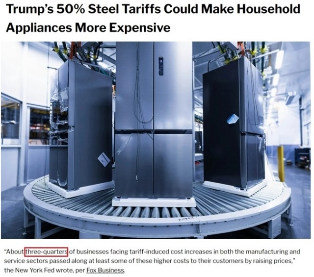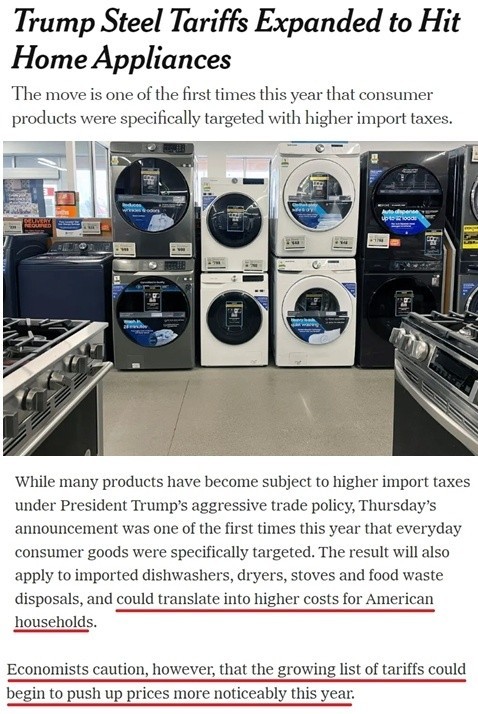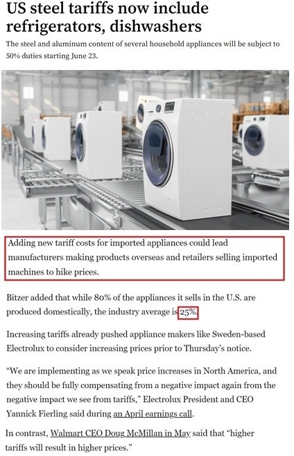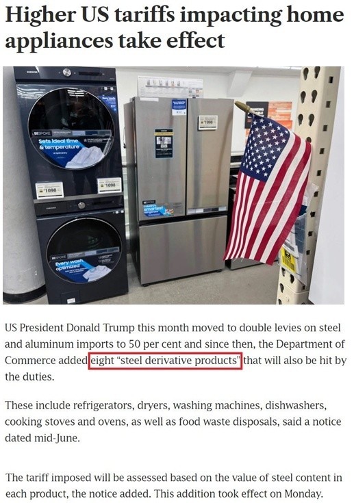 自美东时间23日零点起,本月刚刚被翻倍至50%的钢铝关税将延伸至“钢铁衍生产品”。包括冰箱、烘干机、洗衣机、洗碗机、炉灶、烤箱以及食物垃圾处理设备在内的8类家用电器均适用调整后的税率。