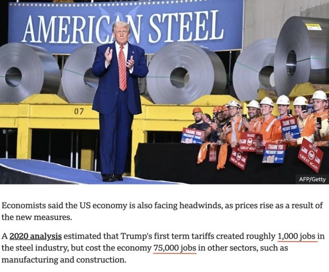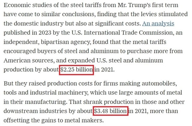 据2020年的一项分析估计,特朗普在第一个总统任期内征收的钢铝关税仅为美国钢铁行业创造了大约1000个工作岗位,却让其他更多下游行业损失了多达7.5万个工作岗位。