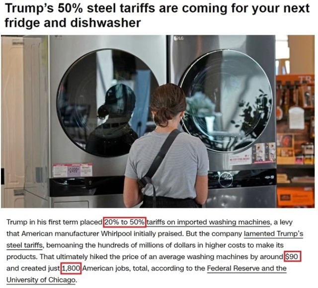 据美联储和芝加哥大学共同测算,当时的钢铝和洗衣机关税最终只给美国创造了1800个工作岗位,却使一台普通洗衣机在美国的售价大涨了约90美元。