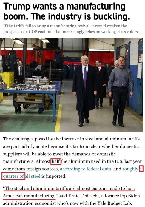 美国《政治报》的评论文章指出,特朗普政府一直誓言要通过征收关税来保护美国工人和产业,从而推动实现制造业繁荣,但目前来看,美国自己的制造商却成了承受最大压力的群体之一。
