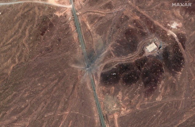 卫星照片显示,伊朗福尔多燃料浓缩厂入口通道上出现新的空袭弹坑。图片来源 视觉中国